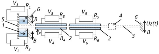 As the literature reviews [12,13,14,15,16,17] show, the most common element in the generator is a cantilever or a linear type element that is fixed at one or two points. There are schemes with fastening of bending elements in the form of a truss structure. A mass or element in the form of a magnetic attachment is attached to some end or intermediate part of such a device. An electrical load in the form of capacitance C, resistance R or inductance L can be applied to each piezoelectric element separately. Typically, a single-component electrical load is used, which has a certain resistance. In [18], the main topologies of load-relief circuits in the form of electrical energy with the simplest composite circuit of a voltage rectifier in the form of a diode bridge are given. Within the framework of the presented work, it is supposed to measure the voltage at individual electrodes. Thus, under dynamic loading, it is possible to investigate the phase characteristics of the removed potential and the potential on each individual piezoelectric element.