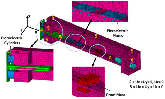 - Khalatkar, A.; Gupta, V.K.; Haldkar, R. Modeling and simulation of cantilever beam for optimal placement of piezoelectric actuators for maximum energy harvesting. Smart Nano-Micro Mater. Devices 2011, 8204, 82042G. [Google Scholar] [CrossRef]
