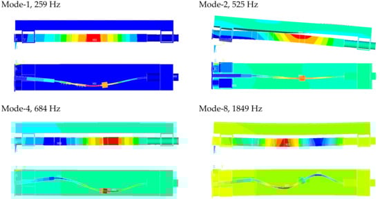 At the first stage, modal PEG analysis was carried out. Figure 4 shows the four vibration modes of the model. With this configuration, the model had a first design frequency of 259 Hz. The vibration mode for the first mode had a prevailing bending character for the generator warp bar. Vibration modes 1, 4 and 8 correspond to (1,2,3) flexural vibration modes of the PEG base plank in the vertical direction. The second mode shape was obtained at 525 Hz. It was assumed that bending deformations of the bar in the smallest plane of rigidity (in the vertical direction) would excite the highest output stress in all PEs.