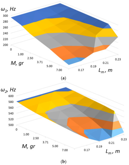 Dependence of 1 (a) and 2 (b) natural frequencies of PEG on the magnitude and location of proof mass at the lowest frequency.