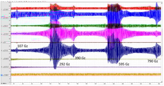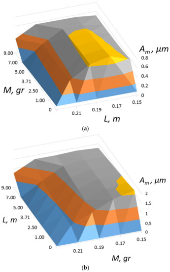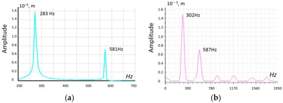 The numerical simulations of harmonic analysis of the PEGs were carried for various configurations. The experimental results were taken care of for PEGs. The simulation and experimental results are shown in Figure 11 and summarized in Table 5. The simulation and experimental results were carried in case the proof mass had been located at 230 mm. The analysis of the comparison of the oscillation parameters of harmonic analysis showed a satisfactory coincidence of experimental data on oscillations and the results of numerical studies of their own frequencies and corresponding oscillation amplitudes for the first two modes within 6%.