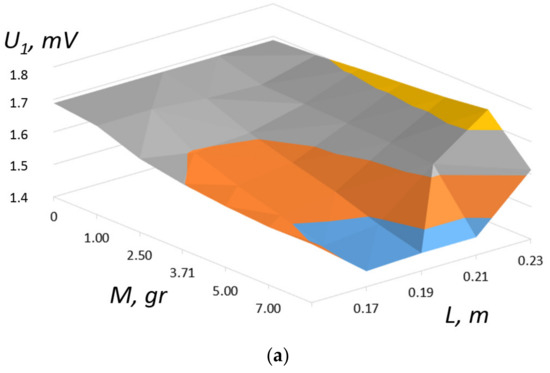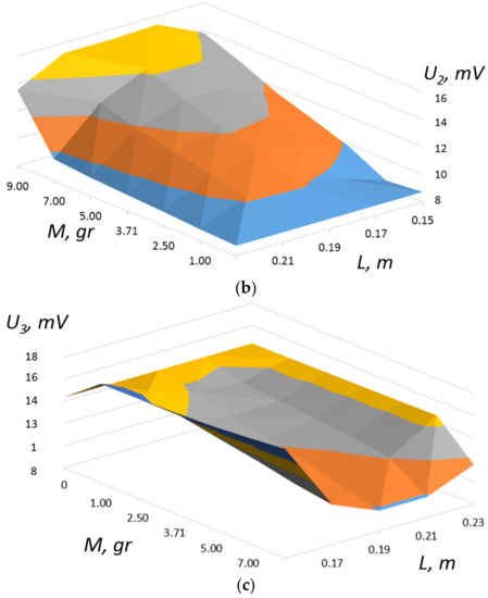 Investigations of oscillations of axial-type PEG under harmonic action were carried out. The harmonic action was calculated under the action of a uniformly applied acceleration of 10 m/s2 for all structural units at the corresponding harmonics. For the first and second vibration modes, the dependences of their value on the mass and location of the load were calculated. The corresponding graphs (Figure 5) show that the lowest frequency values are in the range of 212–220 Hz for the first vibration mode and values of 501–510 Hz can be achieved with the central location of the load and its maximum mass of 9 g. This, at the point of attachment of the load, will be maximum, which is shown in Figure 6. Figure 7 shows the calculated parameters of the dependence of the output voltage at the electrodes of piezocylinders (U1) and piezoelectric elements in the form of plates (U2 and U3), respectively, with their calculated arrangement from left to right (see Figure 1). In the calculations, the value of the active load of the corresponding PE was taken to be 1000 Ω for one vibration mode.