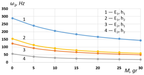 A numerical experiment was set up to establish the dependence of the first oscillation frequency on the associated proof mass 8 (Figure 1). The variable parameters were the modulus of elasticity Ei of the base 7 (Figure 1) and its thickness hi. The proof mass varied within M = 0.5 gr, 30 gr. The place of fixation-proof mass Lm = 150 mm is the point in the middle of the base. Accordingly, at fixed dimensions of the load, the specific density of the material was calculated. It was assumed that the most sensitive characteristic for changing the natural frequency of PEG vibrations is the value of the mass-proof mass. The modulus of elasticity of the volume-proof mass was taken equal to the properties of the base. The base modeling was considered, using the following properties of duralumin for calculations: E1 = 0.7 1011, Pa, ρ1 = 2600 kg/m3, ν1 = 0.33; and using the properties of fiberglass: E2 = 0.06 1011, Pa, ρ2 = 1600 kg/m3, ν2 = 0.33. The thickness of the base (7) was assumed to be h1 = 2 mm and h2 = 1 mm for calculations. Thus, four options for the layout of parameters for modeling were used: 1—E1, h1; 2—E1, h2; 3—E2, h1; 4—E2, h2. The results of numerical calculations obtained on the basis of the modal analysis carried out are presented on Figure 8. An analysis of the obtained frequency dependences shows the following: with an increase in mass for all design simulation options, the first natural frequency decreases. Therefore, with a conditionally small mass of 0.5 gr, the first natural frequency for options was 1—287.4 Hz; 2—154 Hz; 3—122.8 Hz; 55.3 Hz. In this case, the first natural frequency with a mass of 30 gr was, respectively, 1—143.4 Hz; 2—59.7 Hz; 3—50 Hz; 18.5 Hz. In a comparative analysis for all calculation options, the first frequency changed, respectively, for variations, more than 1–2 times, 2–2.57 times, 3–2.45 times and 4–2.97 times. Thus, with various initial parameters of the properties of the base model, the use of this PEG is possible in various loading ranges, both in the low-frequency region up to 50 Hz and in the region of higher frequencies, using only the first oscillation mode up to 287 Hz. The loading mode in the region of more than 50 Hz involves the use of devices for mechanical excitation of oscillations, for example, rotary motors with magnetic media. In addition, these modes of operation of the PEG can be used as the use of the PEG in the form of vibration sensors of the impulse action on the structure in a certain fixed frequency range.