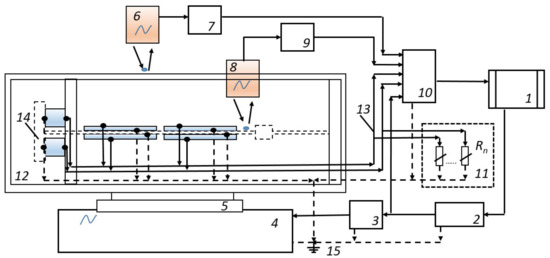 Block scheme of the LTS -01 laboratory test setup for studying the PEG output characteristics: 1—computer with monitor; 2—AFG 3022B Tektronix signal generator; 3—power amplifier LV-102; 4—electromagnetic vibrator VEB Robotron 11077; 5—vibrator working table for fixing the model; 6—RF603 optical linear displacement transducer; 7—optical sensor switching unit (6); 8—optical linear displacement transducer optoNCDT; 9—optical sensor switching unit (8); 10—external ADC/DAC E14-440D module; 11—bank of electric load resistances Rl; 12—the base of the investigated object; 13—matching path; 14—piezoelectric generator of axial type; 15—grounding path.