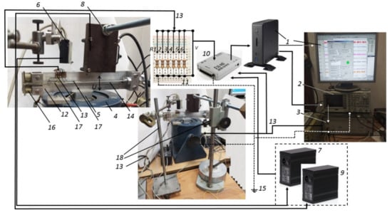 General view of laboratory test setup LTS -01 for studying the output parameters of PEG. 1—computer with monitor; 2—AFG 3022B Tektronix signal generator; 3—power amplifier LV-102; 4—electromagnetic vibrator VEB Robotron 11077; 5—vibrator working table for fixing the model; 6—RF603 optical linear displacement transducer; 7—optical sensor switching unit (6); 8—optical linear displacement transducer optoNCDT; 9—optical sensor switching unit (8); 10—external ADC/DAC E14-440D module; 11—bank of the active electric load resistance R1–R6 of the corresponding PEG elements; 12—the base of the investigated object; 13—matching path; 14—piezoelectric generator of axial type; 15—grounding path; 16—piezoelectric cylindrical type; 17—piezoelectric elements of the plate type; 18—tripods for mounting optical sensors.
