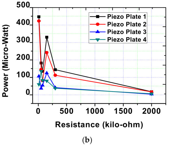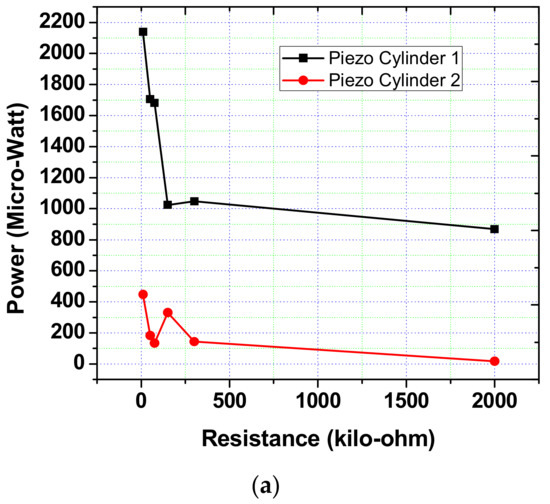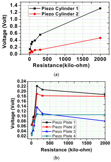Dependence of the output voltage on the magnitude of the load. (a) Piezocylinders and (b) piezoplates.