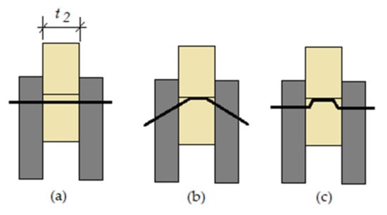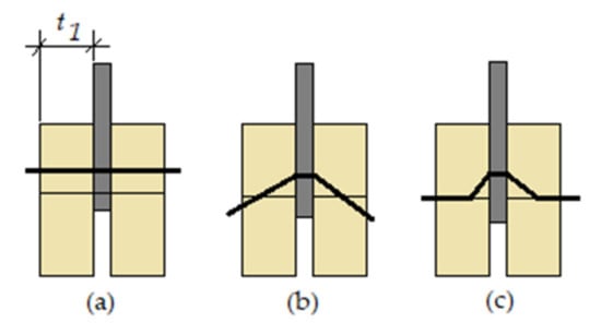 The three different failures modes are shown in Figure 3. The failure mode in (a) represents the wood embedment obtained from Equations (5a) and (6a), the failure mode (b) is the fastener bending from Equation (5b), and failure mode (c) is the combination of the previous failure modes obtained from Equation (6b), [].