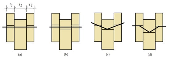 The four modes of failure of the timber-to-timber connections are illustrated in Figure 2, which correspond, respectively, to the four characteristic load-carrying capacities given by the Equation (4a–d). The failure mode (a) represents the bearing failure of the edge members, in (b) it represents the bearing failure of the central member, in (c) it represents the simultaneous formation of the plastic hinge on the fastener inside the central member and bearing failure of all the members and (d) it represents the simultaneous plastic hinge formation in the fastener within all members and bearing failure of all members [,].