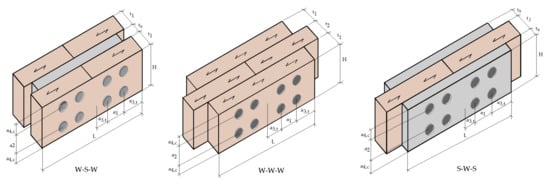 The yield strength, the embedment strength, and the withdrawal strength of the fastener must be considered to determine the characteristic load-carrying capacity of the dowelled connections []. Theoretical models were developed to define the characteristic values of the connection load-carrying capacity, based on the material properties and the dimensions of the connection [,]. Eurocode 5 part 1-1 [] provides simplified equations for calculating the load-carrying capacity of single-shear and double-shear plane in different connection types. In double-shear plane connections, the resistance of each shear plane must be determined. The basic prerequisite for the calculation is the symmetrical arrangement of the connection [].