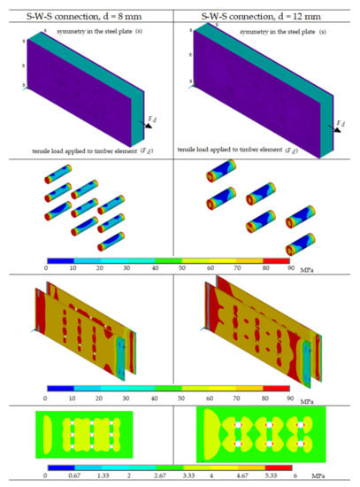 Alternatively, in connections with larger dowel diameters, the level of stress installed around the hole in the wooden element is more pronounced and higher, which facilitates the stress concentration and the wood embedment failure mode.