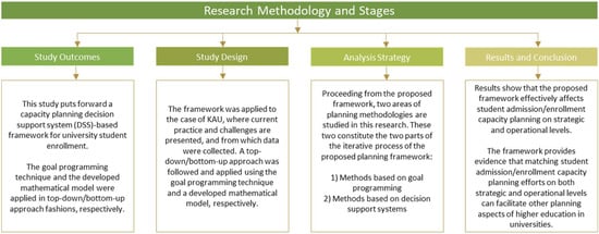 Thus, several newly imposed regulations and legislation have pushed such government-funded institutions to be financially independent and more agile, creating a positive socioeconomic impact, leading entrepreneurship and innovation, and maintaining a high-quality undergraduate and graduate education offering. In theory, the objective of this research study was to put forward a capacity planning admission/decision support system (DSS)-based framework for student enrollment and admission for universities. The case of KAU was presented in terms of its current practice and challenges. In order to achieve these objectives, this research went through several stages, as shown in Figure 1.