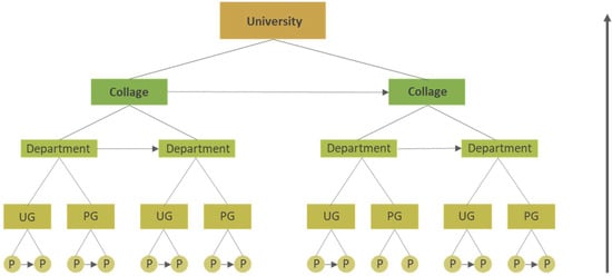 Following the proposed bottom-up framework demonstrated in Figure 2 and proceeding from the collected data in Table 1, the exercise to collect data for a sample faculty was conducted on the instructor, curriculum, and student data dimensions. Then, by fixing (maintaining) the student to faculty ratio, Equation (4) develops the model of the proposed formulation to plan the program-level capacity planning in a bottom-up approach. It converts the program input data acquired from the different data centers into one number, i.e., the student planned capacity for faculty ‘F’. This equation is then repeated for each faculty or program, all mounting up to a total student planned capacity for the university that is then compared to the top-down methodology for better tolerance management. The hierarchy of the cascading and summation of in each program ‘p’ for every department ‘d’ in college ‘c’ will provide the student planned capacity in the university for all colleges ‘C’ using all their departments ‘D’ for all their programs ‘P’. For better illustration, this hierarchical process is shown in Figure 4.