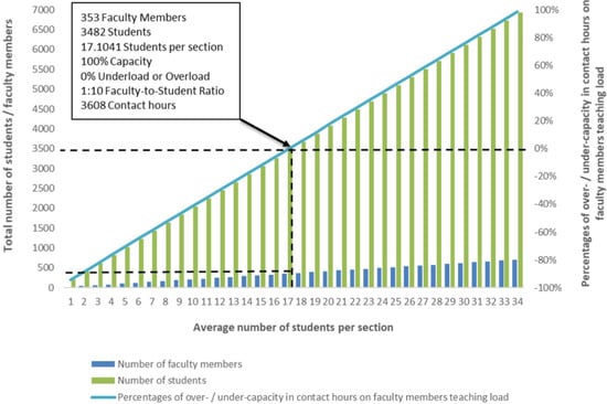 Following the bottom-up model using Equation (4), the results are presented in Table 3. Figure 5 provides a visual summary of the results and demonstrates the optimal student capacity for the faculty of engineering. The horizontal axis represents the average number of students per section in the faculty charted versus the primary and secondary vertical axes representing the total number of students/faculty members and the consequential percentages of over/under capacity in contact hours on faculty members’ teaching load, respectively. Figure 5 shows that for the faculty of engineering to maintain a 1:10 faculty to student ratio and run on 100% teaching load capacity in terms of available contact hours (i.e., 0% over/underload in contact hours), the average number of students per section should be 17.1 students. This implies having a capacity of 3482 students and 353 faculty members with a teaching load of 3608 contact hours.