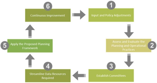 The following chart shown in Figure 6 represents the transitional roadmap for institutions undergoing similar mandates. It requires a deep understanding of the current situation (BAU) and modifying the policies via technical and non-technical means. This process is iterative, as it involves continuous improvement. The first three steps of the roadmap (input and policy adjustments, assessment, and committees) are established in Section 4 and Section 5. Moreover, data streamlining is summarized in Table 1. Additionally, the remaining parts of the roadmap are proposed in the framework.