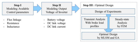 The strategy consists of three steps, as shown in Figure 1. In Step I, the motor control parameters are modeled for loading and ambient operating temperature conditions using the FEM. In Step II, the motor input voltage as an inverter output voltage, which depends on the loading condition and ambient operating temperature, is estimated by calculating the internal inverter voltage drop. Finally, in Step III, the optimal design is conducted using the modeled motor input voltage control parameters. In the optimization process, steady- and transient-state performances are set as objective functions, and the MLSM is used to implement the approximate modeling of the design variables and objective functions. In the LSM, if the response is complex, there is a limit to the global modeling; therefore, the MLSM was used [18]. Finally, the optimization results are obtained using the GA.