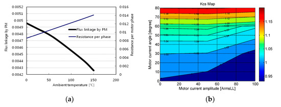 The variation in flux linkage and resistance in response to different ambient operating temperatures is illustrated in Figure 2a. The variation in resistance with respect to the operating temperature is defined using the copper temperature coefficient, and the variation in the flux linkage is obtained through no-load FEM analysis. The saturation coefficient of the core is also distributed, as shown in Figure 2b, by considering the magnetic saturation effect.