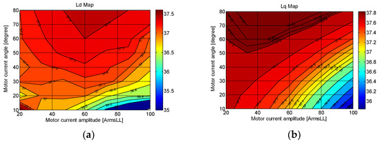 The d–q axis inductance is also an important control parameter when analyzing the motor performance. The inductance varies with the current and phase angle. In addition, an additional torque increase can be generated by the difference between the d-axis and q-axis inductances. This dependence of motor torque on the d and q-axis inductances can be used to control the motor speed. Figure 3 shows the inductance values of the d and q axes with respect to the magnitude of the motor current and phase angle.