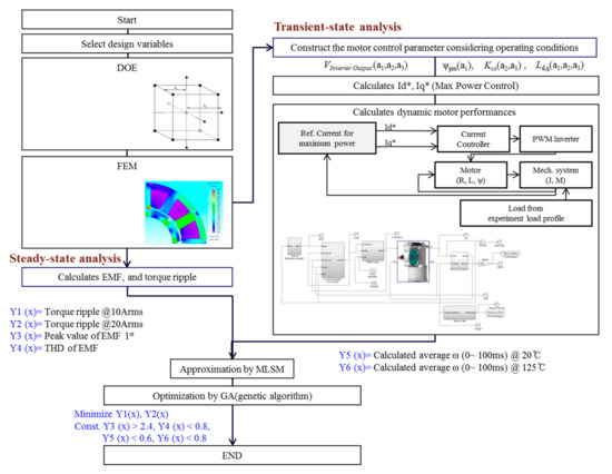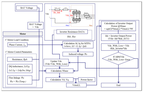 Recently, with the changing automobile structure, electric devices have diversified, and their importance is increasing [1,2,3,4,5]. With the diversification of the quantity and specifications of the motors used in automobiles, the demand for motors that have been customized for various systems is also increasing. Accordingly, research is being conducted on the associated system performance analysis, considering not only the motor but also all the system components. Various co-simulations have been performed to ensure that the designed motor performs optimally in the applied system. An analysis method that combines electromagnetic and thermal analyses for the accurate analysis of heat-generation characteristics of a motor [6,7,8] and various co-simulation methods that combine the optimization technique with the motor design [9,10,11] have been reported. In addition, combined research on motor design and motor control to obtain a detailed analysis of a motor’s behavior has received considerable attention. For this purpose, a recent comprehensive method [12,13,14,15] presented an improved motor control parameter modeling that considers motor performance in combination with the optimal design and a new combined optimization of the steady-state and transient-state operation of the overall system, respectively. However, these methods do not consider the variation in motor control parameters and input voltage, which vary with the ambient operating temperature and loading condition. For accurate motor performance analysis, consideration of not only the motor control parameters but also the available motor input voltage, which depend on the operating state of the motor, is important. This is because, in general, the output power characteristics of a motor greatly vary with the variation in the motor control parameters and input voltage [16].