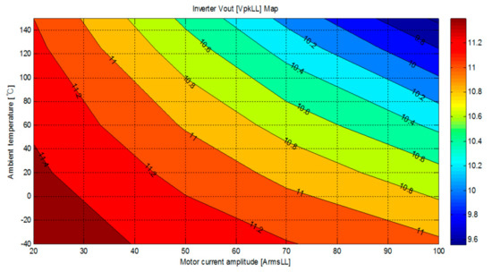 The performance of the motor is significantly affected by its input voltage, which is the same as the inverter output voltage. Because the output voltage of the inverter varies depending on the load condition and operating temperature of the motor, it is necessary to analyze it in consideration of this. For the variation in the ambient operating temperature and loading condition, the motor input voltage is estimated as the inverter output voltage as shown in Figure 5. The motor input voltage tends to decrease as the inverter output current and ambient temperature increase; this also increases the internal losses of the inverter.