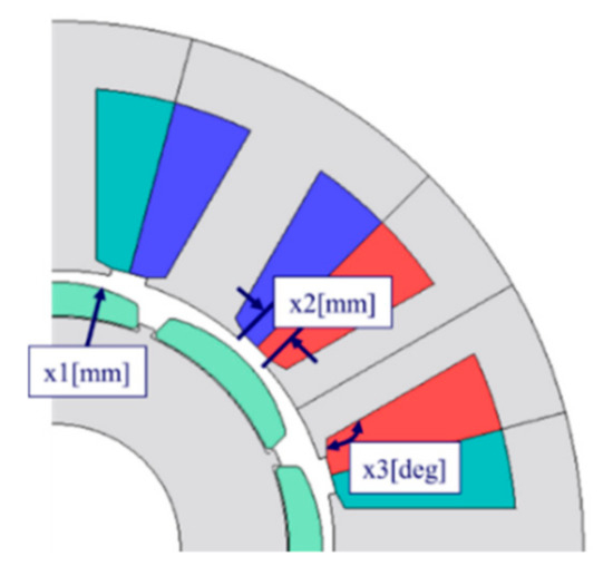 The selected design variables are the outer radius of the permanent magnet (PM), the length of the slot opening, and the angle of the teeth shoe, which are denoted by x1, x2, and x3, respectively, as shown in Figure 7. The ranges of design variables were selected as listed in Table 1 by using central composite design (CCD) as the DOE [17].