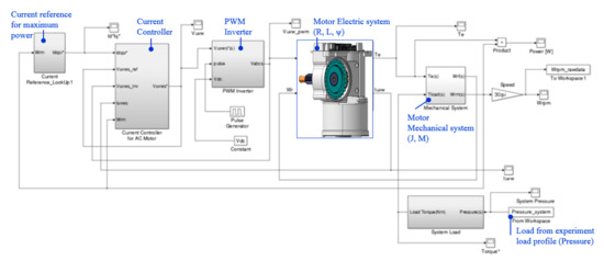 Current vector control [16,20], considering the effects of electrical and mechanical time constants, was performed using the modeled voltage and motor control parameters, and the control strategy is illustrated in Figure 8. In this step, the experimental load profile was utilized.