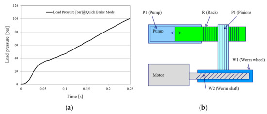 Load pressure: (a) experimental load pressure profile (P1LOAD); (b) concept of the motor and pump gear system of the integrated brake system.
