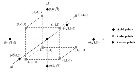 These types of experimental designs are frequently used together with second-order response models. The design consists of three types of points, as shown in Figure 10.