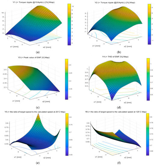 where Y1(x) is the torque ripple at 10 ArmsLL and 20 °C, Y2(x) is the torque ripple at 20 ArmsLL and 20 °C, Y3(x) is the peak value of the EMF at 20 °C, Y4(x) is the THD of the EMF at 20 °C, and Y5(x) and Y6(x) are the ratios of the target speed to the calculated speed at 20 °C and 125 °C, respectively.