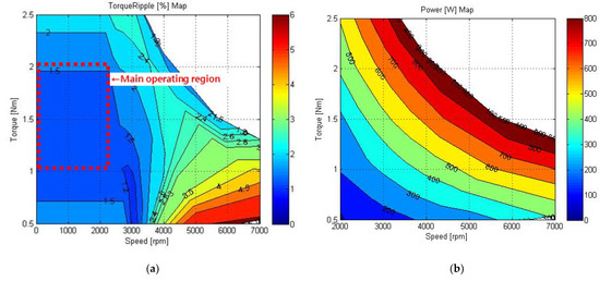 Torque ripple and output power maps in the speed and torque regions at which the optimized model can operate are shown in Figure 15. In the main operation region of the motor, it has a torque ripple level of less than 2%, and it can be seen that it has a high output power characteristic of 800 W or more.