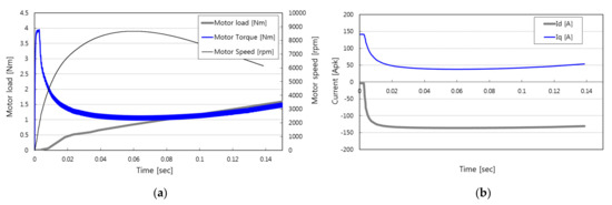 The speed response of the optimized model during a rapid braking operation is shown in Figure 16a. As a result of the analysis, it can be confirmed that high-speed operation of up to 8000 RPM or higher is possible. Figure 16b shows the Id and Iq traces for the maximum power control during hard braking.