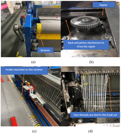 Hooks are mounted on a strainer: (a) The strainer rotates to wind the trampoline mattress during the weaving process, (b) rapier is driven by a rack and pinion mechanism, (c) hooks are mounted on a strainer, (d) yarn thread is tied to the hook one by one at both sides of the machine.