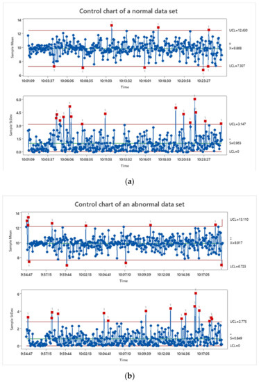 SPC control charts of two different data sets: (a) control Chart of a normal signal pattern, (b) control Chart of an abnormal signal pattern.