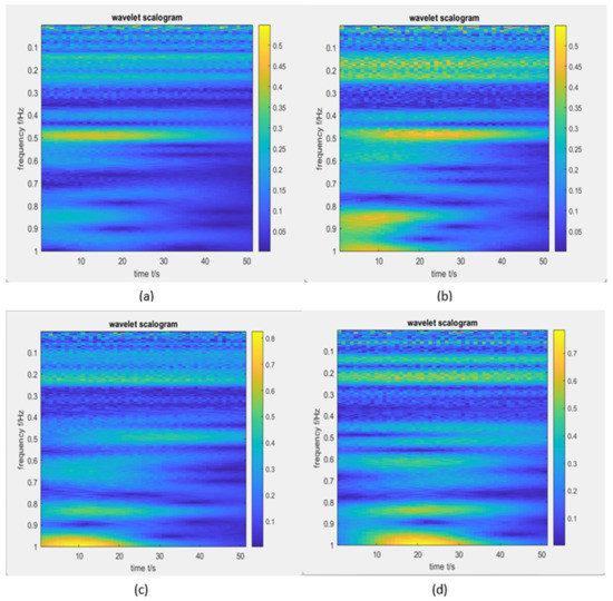 Four of the 31 CWT scalograms in one semi-time segment: (a) fuzzy pulses in frequency ranges 0.4–0.5 Hz and others, (b) fuzzy pulses in frequency ranges 0.4–0.5 Hz, 0.8–0.9 Hz, 0.9–1.0 Hz and others, (c) fuzzy pulses in frequency ranges 0.9–1.0 Hz and others, (d) fuzzy pulses in frequency ranges 0.8–0.9 Hz, 0.9–1.0 Hz and others.