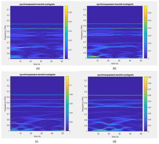 The synchrosqueezed wavelet transform synchrosqueezed scalograms of the four CWT scalograms shown in Figure 6: (a) more concentrated pulse in frequency range 0.4–0.5 Hz, and a new pulse was found around frequency 0.8 Hz, (b) more concentrated pulses in various frequency ranges, (c) more concentrated pulse in frequency range 0.9–1.0 Hz, (d) more concentrated pulses in frequency ranges 0.8–0.9 Hz and 0.9–1.0 Hz, moreover, the time information is explicit compared with Figure 6d.