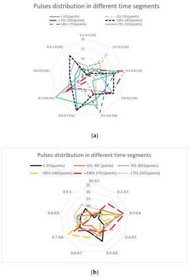 Pulse distribution in different time segments of another two data sets: (a) pulse distribution of frequency ranges in different time segments of an abnormal data set, (b) pulse distribution of frequency ranges in different time segments of a normal data set.