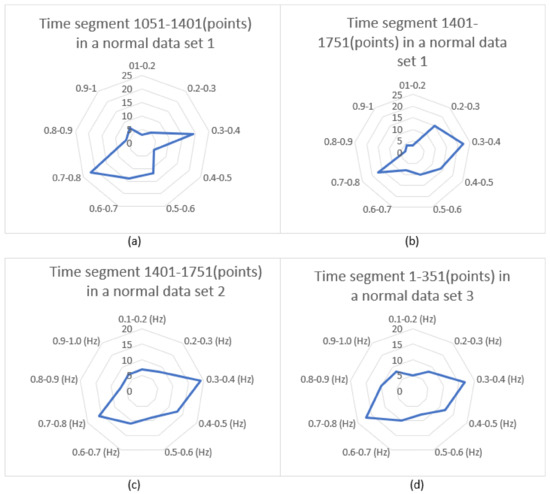 Number of pulses in different frequency ranges for “normal” data sets: (a) feature 1 in time segment 1051–1401 (points) of data set 1, (b) feature 2 in time segment 1401–1751 (points) of data set 1, (c) feature 3 in time segment 1401–1751 (points) of data set 2, (d) feature 4 in time segment 1–351 (points) of data set 3.
