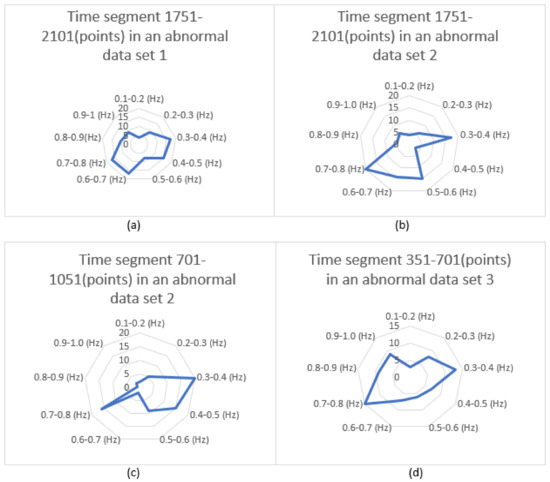 Another set of number of pulses in different frequency ranges for “abnormal” data sets: (a) feature 5 in time segment 1751–2101 (points) of abnormal data set 1, (b) feature 6 in time segment 1751–2101 (points) of abnormal data set 2, (c) feature 7 in time segment 701–1051 (points) of abnormal data set 2, (d) feature 8 in time segment 351–701 (points) of abnormal data set 3.