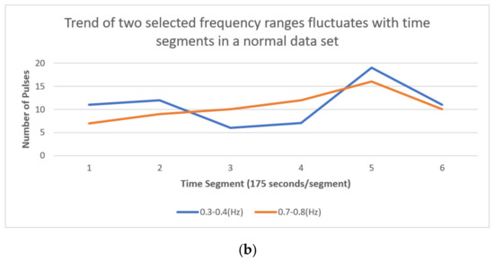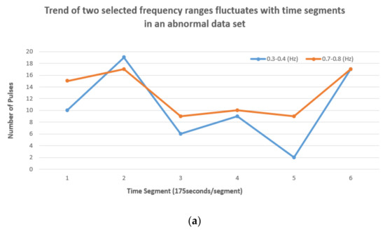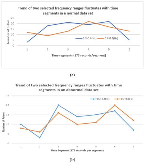 Trend of two selected frequency ranges fluctuates with time segments in another two data sets: (a) number of pulses in the two dominant frequency ranges along time segments in an abnormal date set, (b) number of pulses in the two dominant frequency ranges along time segments in a normal data set.