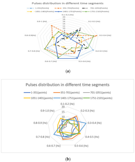 Again, the dominant frequency ranges of 0.3–0.4 Hz and 0.7–0.8 Hz were observed. The number of pulses in these frequency ranges were plotted against time segments as shown in Figure 13a,b.