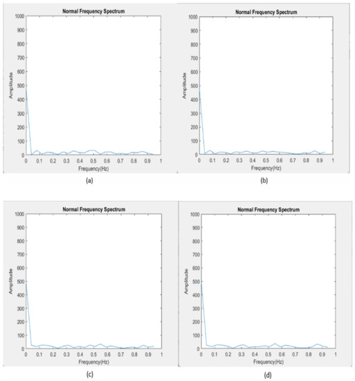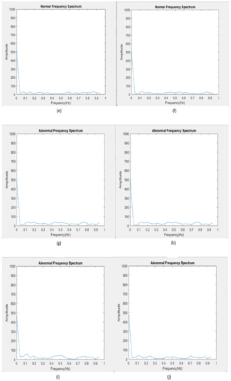 Having introduced the proposed data processing method, we also want to validate the result of segmented FFT. We choose the same segmented time interval shown in Figure 6 and Figure 7, i.e., 350 data points with 50 data points overlap. We generate numbers of segmented FFT figures. Figure 14 shows 12 spectrums generated by segmenting the data sets that produced Figure 4 and Figure 5, then we select 6 consecutive segmented FFT spectrums, respectively, from Figure 4, Figure 5 and Figure 14a,f are segmented normal FFT spectrums, while Figure 14g,l are abnormal segmented FFT spectrums. The results are demonstrated below.