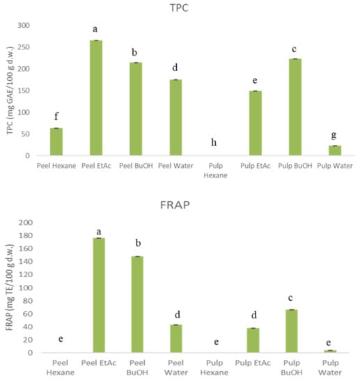 All analysis (TPC, FRAP and UPLC-MS/MS) were performed in triplicate (n = 3). To evaluate differences at a 95% confidence level (p ≤ 0.05) between antioxidant activity and the TPC of peel and pulp from the different extracted fractions, a one-way analysis of variance, Pearson’s linear correlation and ANOVA (Tukey’s honestly significant difference test with multiple comparisons) were employed using XLSTAT 2016.