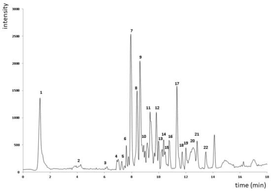 Four compounds were characterized among the group of other polyphenols. In this regard, coumarin (peak 2, [M − H]− ions at m/z 145.0274) and pyrogallol (peak 15, [M − H]− ion at m/z 125.0229) were identified using commercial standards as highlighted in Table 1. Peak 4, with molecular formula C8H8O, was tentatively characterized as vinylphenol. Its main fragment yielded at m/z 101 corresponds to the loss of one molecule of water. Vinylphenols, in particular 4-vinylphenol and 4-vinylguaiacol, have been documented in citruses such as blood orange or in Citrus aurantium L. bloom [34], but not in the studied matrix.