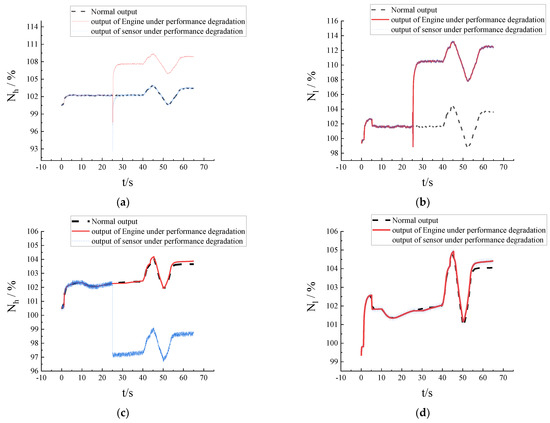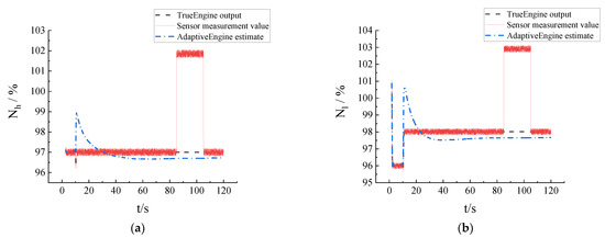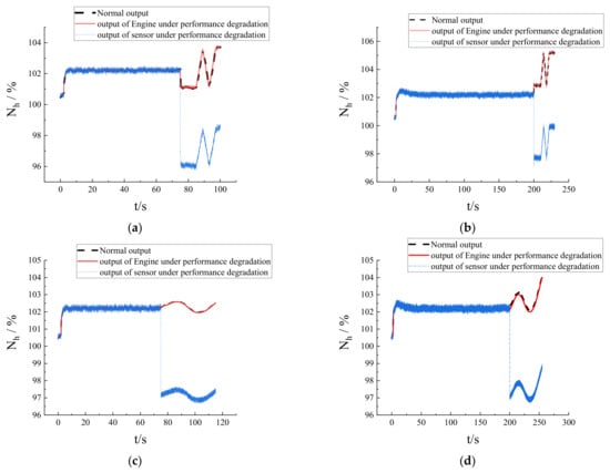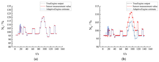 Figure 3a,b simulation experiments show that after the failure of the Nh sensor, when the value of the fault sensor is used as the feedback quantity of the closed-loop control, the real operating parameters of the engine are all higher than the normal working state, and accidents are easy to occur. However, if other sensors fail, although the value of the corresponding fault sensor is reduced, because of taking the method of changing the residual to zero that Kalman filter needs, when the sensor fails, the fault sensors are quarantined and the real operation parameters of the engine are still in the normal working state, i.e., the fault-tolerant effect is better.