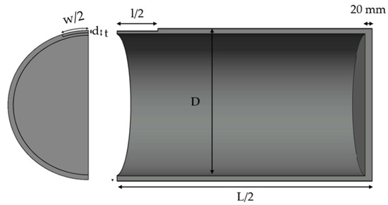 ANSYS (16.1) Mechanical APDL was used for the FEM. The considered material was an API 5L X65 grade steel pipeline, and the pipe model had an external diameter (De) of 300 mm, a wall thickness (t) of 10 mm, and a pipe length (L) of 2000 mm. A quarter of the symmetrical pipe was modelled with a corrosion defect to reduce the needed computational resources. Figure 1 shows the dimension of the quarter pipe model.