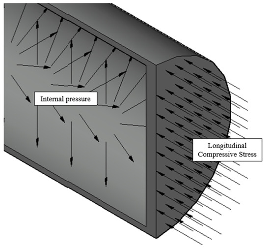 A pipe end cap was modelled for the application of longitudinal compressive stress to ensure more accurate FEA results [13]. Figure 2 shows the internal pressure applied on the internal surfaces, while longitudinal compressive stress was applied on the surface of the end cap. The loads were incrementally applied using timesteps through ramped loading in ANSYS. Longitudinal compressive stress was incrementally applied in the first timestep. Internal pressure was then incrementally applied in the second timestep while maintaining the load in the first timestep.