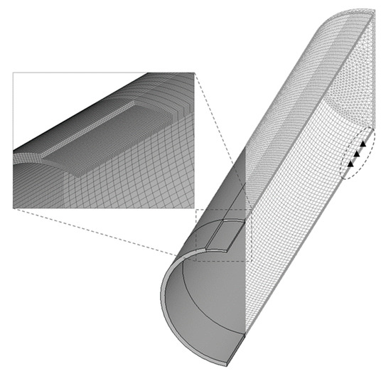 The pipe body was brick-meshed with a SOLID185 element, and the pipe end cap was free-meshed with a SOLID186 element. The corrosion defect depth was modelled with three layers of element, and the thickness of the pipe was modelled with six layers of element for more accurate FEA [22]. To prevent unwanted motion when longitudinal compressive stress was applied, the model was constrained in three nodes near the end cap, as denoted by the triangle symbol in Figure 3 [20,23,24]. Preliminary analysis showed negligible differences between the number of constrained nodes and their position (in the region at the end of the pipe model), with solution convergence. The density of element for the pipe model was distributed based on the region of interest in this study. The density at corrosion defect was the highest, and the element density gradually decreased away from the corrosion defect, as shown in Figure 3.