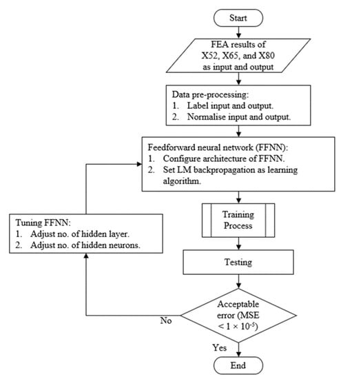 An artificial neural network (ANN) is a machine learning technique suitable for supervised learning. It can be used to solve regression problems because of its ability to map complex relationship in a nonlinear dataset. In this study, a feedforward neural network (FFNN) was used. The network comprised an input layer, hidden layer(s), and an output layer. The network was trained with the FEA results of the X52, X65 and X80 pipelines with a single corrosion defect subjected to internal pressure and longitudinal compressive stress. In the ANN, the true UTS of the pipes, corrosion defect parameters, and longitudinal compressive stress were used as inputs, and their corresponding failure pressure was the target output. The inputs and outputs were normalised to prevent inputs with large values from dominating other inputs. The X52, X65, and X80 FEA results were randomly divided into a training set (70%), a validation set (15%), and a test set (15%). The validation and test sets were used to prevent overfitting. The Levenberg–Marquardt (LM) backpropagation algorithm was used as the learning algorithm to train the ANN model. The LM backpropagation algorithm is more efficient than other learning algorithms due to its second-order convergence rate. It converges faster in fewer epochs [27]. The architecture of the neural network was reconfigured through trial and error in order to prevent overtraining and improve prediction accuracy. Hyperparameters such as the number of hidden neurons and the number of hidden layers were tuned so that the mean squared error, MSE < 1 × 10−5. The ANN development framework is shown in Figure 5.