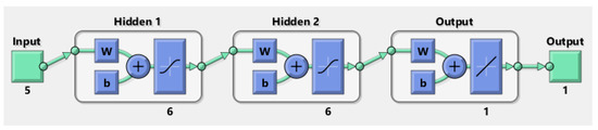After training the ANN, the weights and biases were adjusted for output predictions with the lowest errors. The connections between the input, output, hidden neurons, and their weights and biases were mathematically expressed, as shown in Equations (6)–(8).
