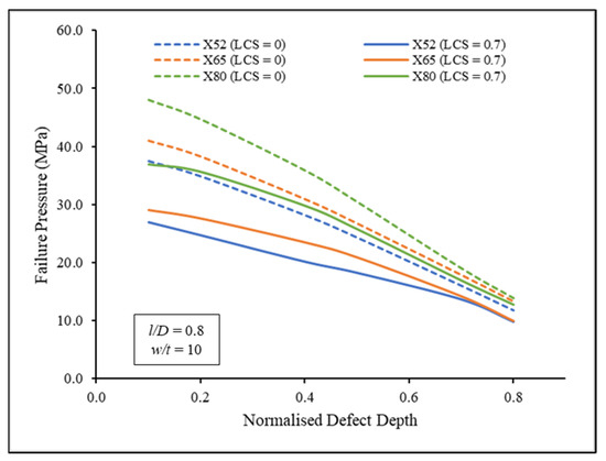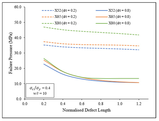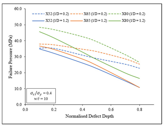 A parametric study was conducted to investigate the effects of material property, defect depth, defect length, and longitudinal compressive stress on the remaining strength of corroded pipelines with single corrosion defects. The middle-to-high strength pipelines considered in this study were X52, X65, and X80. Figure 9 shows the effect of defect depth on failure pressure for corroded pipelines with 0.0 and 0.7 longitudinal compressive stress when the defect length was fixed at 0.8 and defect width was fixed at 10 . Figure 9 shows that the X80 trendline presented the highest failure pressure on average, followed by X65 and X52. The trendlines demonstrate the same behaviour, whereby the failure pressure of the corroded pipeline linearly decreases with an increase in defect depth, and the introduction of longitudinal compressive stress significantly reduced the failure pressure. For trendlines with no longitudinal compressive stress, the average failure pressure reduction rates per 0.1 of the X52, X65, and X80 pipelines were −8.51%, −8.87%, and −9.70%, respectively. For trendlines with 0.7 , the average failure pressure reduction rates per 0.1 of the X52, X65, and X80 pipelines were −5.51%, −4.85%, and −6.92%, respectively. It can be observed that the average reduction rate for failure pressure was reduced when increased from 0.0 to 0.7. However, the failure pressure of the corroded pipe subjected 0.7 was still significantly lower than 0.0 (−23.99% on average). The trendlines of the same material type exhibited similar behaviour, whereby the failure pressure of 0.2 defects between 0.0 and 0.7 was reduced by almost half when the defect depth was 0.8 . Similar trends were observed for defect lengths of 0.2, 0.4, 1.0, and 1.2 .