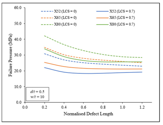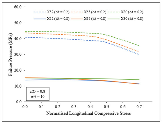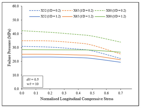 Figure 12 shows the effect of longitudinal compressive stress on failure pressure for a corroded pipeline with 0.2 and 1.2 normalised defect depths when the defect length was 0.5 . The trendlines in Figure 12 demonstrate a similar pattern across all three types of material for both short and long corrosion defects. The failure pressure of long corrosion defects was lower (on average −25.00%) than the failure pressure of short corrosion defects, though it was not as significant as that shown in the trendlines of Figure 11. Similar trends were also observed for defect depths of 0.2, 0.4, 0.6, and 0.8 .